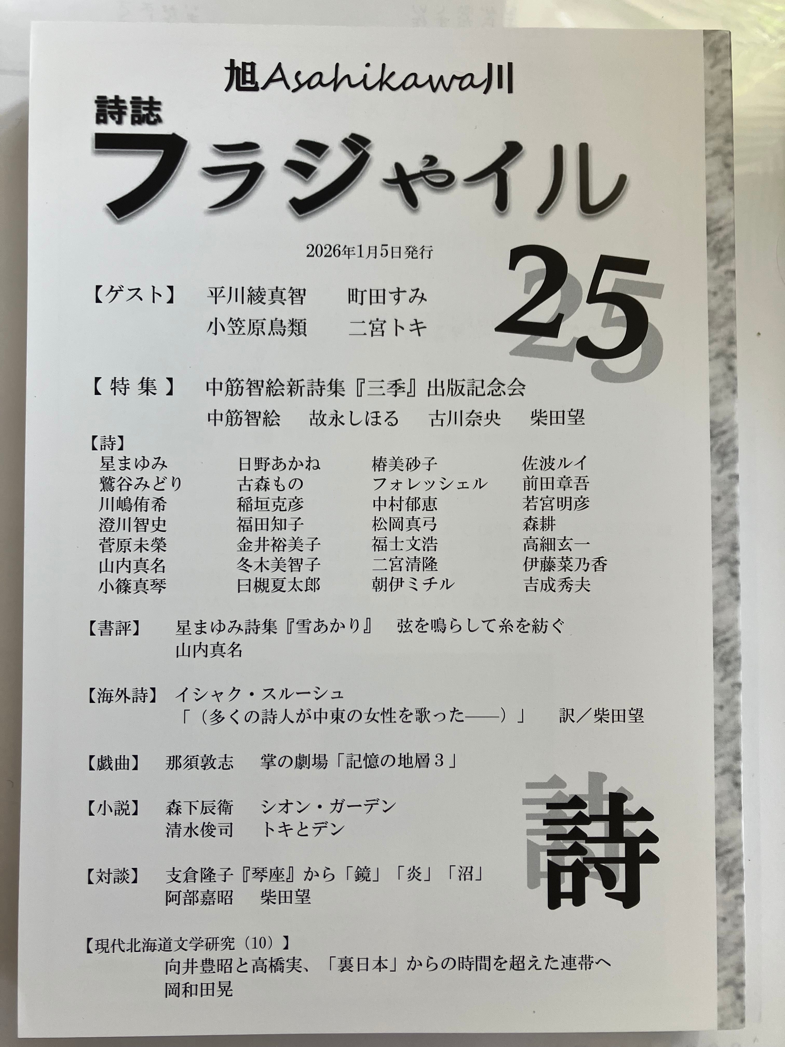 詩の町、北海道旭川から発信している詩誌フラジャイルの最新号25号です。伊藤菜乃香「農園の菊」収録されております。